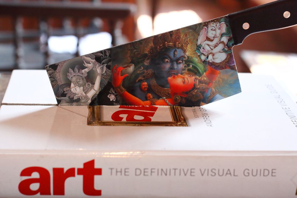 Be it his abstract paintings or his ‘wounded’ books, Kingsley’s works are sensory responses to the experience of violence, as well as the perpetration of acts of violence. His prolific methodology is quick and aggressive and consistently resisting statist, dominant narratives that exist in a post-war era. The spine of his book practice is inspired from the burning of the Jaffna Library in 1981, which is reiterated through a meditative practice of burning and cutting; an act of remembering and that of a witness.